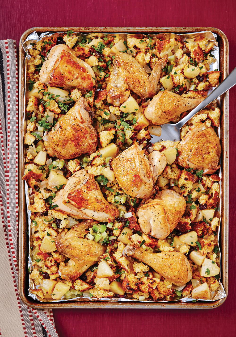 Pour dry stuffing mix over chicken. Rotisserie chicken and stuffing casserole with a creamy layer in between is a warm, comfort food for winter evenings or holiday dinners. It is the perfect comfort food, especially when it is cold outside.