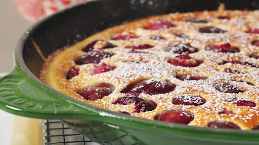 Clafoutis, sometimes spelled clafouti (Cla-fu-tea), is a baked French dessert of fruit, traditionally cherries, arranged in a buttered dish and covered with a thick eggy batter. Originally from Limousin, France, a rural region in south-central France, the name "clafoutis" is derived from clafotís, which means "to fill" in local Occitan dialect. Clafoutis recipe is too easy not to try.